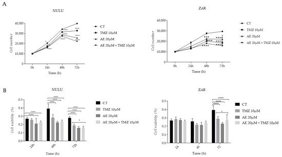 Effect of 20 μM AE alone and in combination with 10 μM TMZ on cell growth and viability in primary GBM lines, NULU and ZAR. (A) Effect of AE, as a single agent and in combination with TMZ, on the number of NULU and ZAR primary GBM cells exposed daily to TMZ 10 μM, AE 20 μM, and AE 20 μM and TMZ 10 μM for 24, 48, and 72 h; (B) cytotoxic effects of daily exposure to TMZ 10 μM, AE 20 μM, and AE 20 μM and TMZ 10 μM for 24, 48 and 72 h on the cellular metabolism of NULU and ZAR GBM cells. For all experiments, the reported values are the mean ± SEM of 3 independent determinations: one-way ANOVA test, Dunnett’s multiple comparison test, p-value < 0.05 is significant. According to the GraphPad Prism 7 software, * p-values between 0.01 and 0.05; *** p-values between 0.0001 and 0.001 (compared to the control); a **** p-value < 0.0001 (compared to the control); a # p-value between 0.01 and 0.05 (compared to TMZ).