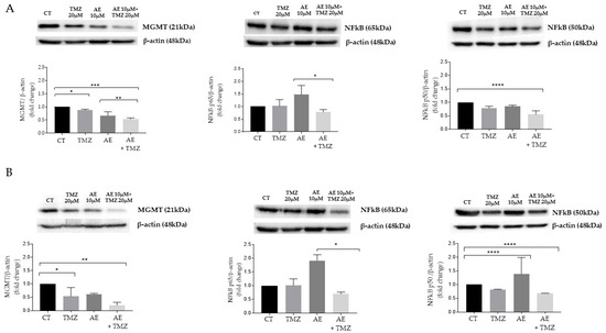 Among the several transcription factors known to regulate MGMT protein expression, the activity of the factor NF-κB is well known [19,20]. In order to determine a potential correlation between the reduction in MGMT protein expression and the transcription factor NF-κB, we assessed the Western blot of protein lysates from the NULU and ZAR lines treated with TMZ and AE. Figure 2A,B show the expression of the two subunits that compose the transcription factor NF-κB, p50, and p65. In NULU and ZAR lines, which express MGMT, the combined treatment with AE 20 μM and TMZ 10 μM significantly reduced the expression of the p65 and p50 subunits compared to the untreated control and samples subjected to single treatment (AE alone or TMZ alone). These results suggested that the downregulation of MGMT may be directly related to reduced NF-κB transcriptional activity. This downregulation could be functionally translated with a higher TMZ sensitivity.