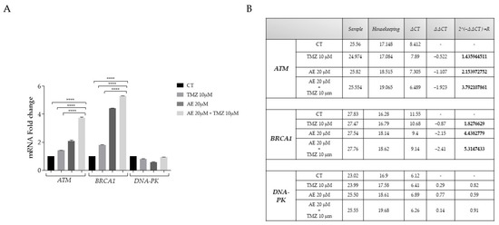 Real-time PCR of ATM, BRCA1, and DNA-PK. ATM, BRCA1, and DNA-PK mRNA after treatment with AE 20 μM alone and combined with TMZ 10 μM DNA damage repair genes expression in NULU GBM primary cells were determined by real-time PCR. The total RNA was extracted from the NULU cells after treatment with 20 μΜ AE for 72 h, and RNA samples were reverse transcribed for cDNA and then for real-time PCR, as described in Materials and Methods. The ratios of ATM, BRCA1, and DNA-PK mRNA compared to GAPDH (A) are presented; **** p-values < 0.0001 (compared to the control). Data represent the mean ± SEM (B).