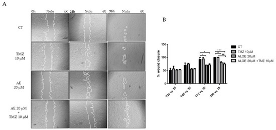 In fact, for both cell lines treated with only AE 20 μM or with AE 20 μM and TMZ 10 μM, the scratch was still open after 96 h of exposure. The inability of TMZ 10 μM to control NULU and ZAR cell migration underscores how adjuvant treatment with AE could reduce the ability of cells to migrate and dare to recur at sites distant from the site of GBM origin.