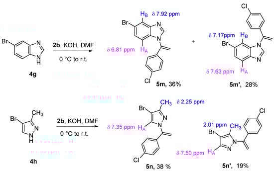 As shown in Scheme 3, the N-vinylation reaction of unsymmetrical benzo-fused or monocyclic diazoles can lead to two regioisomers due to the functionalization at the NH position of the two tautomers. The N-vinyl benzoimidazole regioisomers 5m and 5m′ were isolated when the 5-bromo benzoimidazole 4g was employed as nucleophile. These compounds were separated in pure form by column chromatography in an almost 1:1 ratio. Structures were assigned according to the coupling constants and the shielding effects observed in their 1H NMR spectra. In both cases, the 4-chloro phenyl group causes a shielding effect on the benzoimidazole proton falling into its shielding cone. In particular, HA appears as a doublet at 6.81 ppm (d, 3J = 8.6 Hz) in the compound 5m and at 7.63 ppm (d, 3J = 8.6 Hz) in the compound 5m′, while the proton HB absorbs at 7.92 ppm (d, 4J = 1.1 Hz) in the compound 5m and 7.17 ppm (d, 4J = 1.9 Hz) in the compound 5m’. The structural assignment was confirmed by NOESY experiments (see supporting information). Similarly, the N-vinylation of the 4-bromo-3-methyl-1H-pyrazole 4h led to the two regioisomers 5n and 5n′ in a 2.5:1 ratio. The formation of 5n’ as minor isomer suggests that the steric hindrance of the methyl group plays a significant role in the N-functionalization.