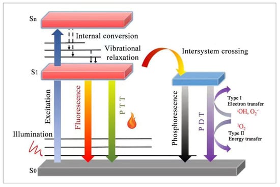 Phototherapy is considered to be an advanced treatment strategy because of its advantages of non-invasiveness, limited drug resistance, low side effects as well as high temporal and spatial selectivity [11]. Photodynamic therapy (PDT) and photothermal therapy (PTT) are the two main modalities of phototherapy (Figure 2). PDT mainly utilizes photosensitizers to boost ROS upon irradiation to perform treatments [12]. The potency of PDT is mainly achieved through three pathways: Firstly, there is the direct killing of tumor cells, leading to their necrosis. Secondly, the ROS generated by photodynamic therapy induces irreversible oxidation damage, leading to cell apoptosis. Thirdly, there is photodynamic death or the stimulation of immunogenic cell death by dead cells, resulting in a series of effects and applications in the later stage [13]. Photodynamic therapy and photothermal therapy are the two main modes of phototherapy, and they achieve the treatment of tumors by generating reactive oxygen species (ROS) and local heat; the detailed mechanism is as follows. When a suitable light is used to illuminate a photoactive molecule, the molecule’s absorbed light energy transitions from the singlet ground states (S0) to the singlet excited states (S1). Molecules in the singlet ground states are unstable and will transition back to the ground states by three relaxation modes. (1) They return to the singlet ground states by a radiation transition to produce fluorescence, which is the basic principle of fluorescence imaging. (2) Heat is generated by returning to the singlet ground states through vibration relaxation, which is the basis for photothermal therapy. (3) Intersystem crossing (ISC) occurs, producing molecules in excited triplet states, and then energy transfer (Type-II) or electron transfer (Type-I) occurs between molecules and the surrounding oxygen, generating singlet oxygen and free radicals, and is the basis for photodynamic therapy [14,15]. Although phototherapy has been proven effective in tumor treatment, its clinical application still faces many challenges. Phototherapy has great advantages over traditional cancer treatments, but its clinical application still faces challenges. First of all, limited by the tissue penetration of the laser, phototherapy can currently only treat superficial tumors. Then, poor targeting of tumor tissue may cause reduced therapeutic efficacy and increases toxic side effects. Finally, for photodynamic therapy, the high consumption on oxygen severely limit the treatment performance. For photothermal therapy, local high temperature may cause side effects such as inflammation, while low temperature may induce the expression of a heat shock protein in tumor cells and cause poor treatment effect. Therefore, the precise control of the local heat is also a major challenge for further clinical application [16]. In recent years, researchers have continuously improved it through different aspects, including the continuous exploration and optimization of the preparation method of phototherapy nanoparticles [17,18,19].