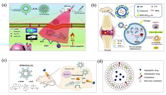 Even though thin-film hydration is currently one of the most common methods for liposome preparation, it is difficult to achieve mass production and a high market size. Eissa’s group mainly used thin-film hydration to prepare niosomes (Figure 4d). Niosomes are non-ion-based vesicles with great potential in the field of phototherapy due to their unique characteristics and ability to encapsulate hydrophilic and lipophilic substances [32]. Compared with the preparation of liposomes, niosomes do not require complex processes and high costs, and are easier to produce on a large scale. At the same time, niosomes have a higher stability and longer shelf life [32].