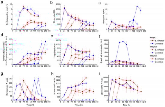 Production profiles of secondary metabolites biosynthesized by S. rimosus in mono- and cocultures over the course of the PRSR1, PRSR2, and PRSR3 experiments, namely, oxytetracycline (a) and the metabolites tentatively identified as rimocidin (b), rimocidin B (c), unnamed angucycline from Streptomyces sp. QL37 (d), turgichelin (e), 2-methylthio-cis-zeatin (f), rimosamide A (g), lucensomycin (h), and spinoxazine A (i). The mean values from three replicates are shown with error bars representing ± standard deviation. AU-auxiliary units.