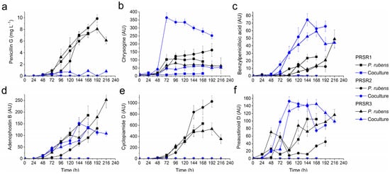 Regarding the production of penicillin G (Figure 2a), cocultivation clearly exerted negative effects on the biosynthetic process. Among the tested cocultures, only PRSR3 resulted in detectable levels, although the corresponding titers were very low, i.e., not exceeding 1 mg L−1 (Figure 2a). An even stronger inhibitory effect was noted with regard to cyclopiamide D production (Figure 2e), which was completely turned off as a result of cocultivation. In contrast, there was an evident boost in benzylpenicilloic acid (Figure 2c) and preaustinoid D (Figure 2f) levels in the PRSR2 and PRSR3 cocultures compared to the corresponding P. rubens monocultures. Furthermore, the stimulation of adenophostin B (Figure 2d) and chrosogine (Figure 2b) biosynthesis was recorded for the PRSR2 cocultivation. The levels of P. rubens metabolites in the PRSR2 and PRSR3 cocultures increased only until a certain time point (e.g., 144 or 168 h in the case of adenophostin B production in the PRSR2 and PRSR3 experiments, respectively, as shown in Figure 2d) and then declined toward the end of the cocultivation process.