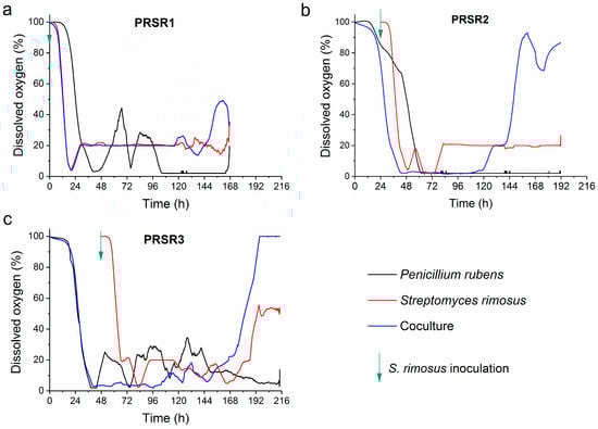 For the PRSR2 coculture, the level of DO was close to zero from 48 to 120 h. Similar behavior was recorded for the PRSR3 coculture, where the DO was close to zero from 48 to 96 h. Then, the DO increased abruptly in PRSR2 and PRSR3 cocultures. This behavior was probably associated with the changing composition of microbial populations in the bioreactor. The period of very low DO levels corresponded to the time of intensive oxygen consumption by the biomass of P. rubens. When the development of S. rimosus biomass started to exert inhibitory effects on P. rubens, the DO levels in PRSR2 and PRSR3 cocultures started to increase as well. In other words, the consumption of oxygen by fungal biomass was weakened due to the increasing activity of S. rimosus in the coculture. At the same time, the development of S. rimosus in the late phase of PRSR2 and PRSR3 cocultures was not associated with intensive oxygen consumption since the DO levels gradually increased towards the end of the cocultivation. It should be pointed out that the conditions were not favorable for S. rimosus to proliferate, i.e., the fungal biomass and secondary metabolites were present in the bioreactor, and the levels of nutrients were not as high as in the fresh medium. It could be the reason why the development of S. rimosus in the late phase of PRSR2 and PRSR3 cocultures was accompanied by the increase in the DO levels. Finally, it should be noted that the current efforts were focused on monitoring the measurable effects of cocultivation, with a focus on secondary metabolite production, but the molecular details of microbial interactions and the mathematical consideration of population dynamics were beyond the scope of the study and need to be addressed in future experimental work.