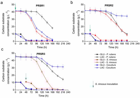 Levels of carbon substrates (glucose and lactose) in the monocultures and cocultures of S. rimosus and P. rubens over the course of the PRSR1 (a), PRSR2 (b), and PRSR3 (c) experiments. The time of S. rimosus inoculation is depicted by an arrow. The mean values from three replicates are shown with error bars representing ± standard deviation. GLU—glucose; LAC—lactose.