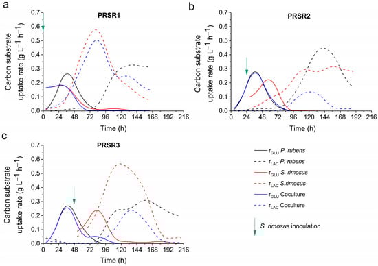Volumetric uptake rates of glucose rGLU and lactose rLAC in the monocultures and cocultures of S. rimosus and P. rubens over the course of the PRSR1 (a), PRSR2 (b), and PRSR3 (c) experiments. The time of S. rimosus inoculation is depicted by an arrow. GLU—glucose; LAC—lactose.