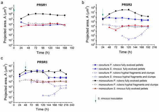 Projected area (A) of fully evolved pellets and hyphal fragments and clumps in the monocultures and cocultures of S. rimosus and P. rubens over the course of the PRSR1 (a), PRSR2 (b), and PRSR3 (c) experiments. The time of S. rimosus inoculation is depicted by an arrow. The mean values calculated for at least 30 morphological objects and the confidence bands (significance level α = 0.05) are depicted.