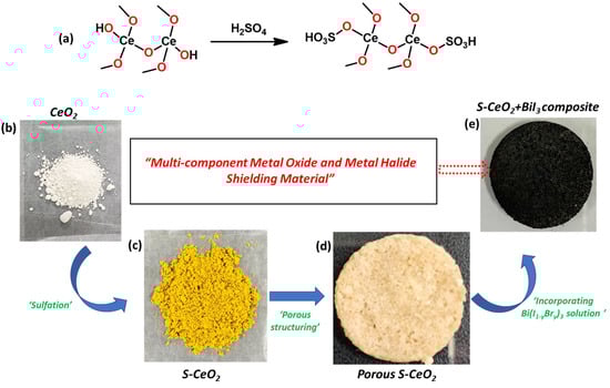 Preparation of the S-CeO2 nano powder and S-CeO2/BiI3 composite shielding material. (a) Scheme of sulfonation of CeO2. Photographs of (b) pure CeO2, (c) S-CeO2, (d) porous S-CeO2 coin-shaped sponge, and (e) S-CeO2/BiI3 composite.
