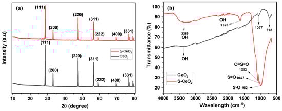 (a) Powder XRD patterns and (b) FT-IR spectra of pure CeO2 (black) and S-CeO2 (red).
