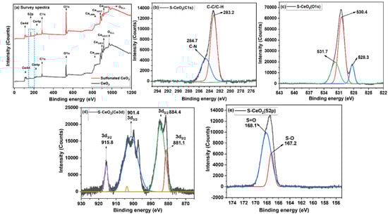 The XPS profiles of CeO2 and S-CeO2 are shown in Figure 3. Figure 3a shows the survey spectra of CeO2 and S-CeO2, and peaks corresponding to all the expected elements were observed. However, a new peak in the S-CeO2 spectrum with a binding energy of 167 eV was also observed (blue dashed frame), and this can be attributed to the S2p component, demonstrating that sulfonic acid groups were bound to CeO2. Figure 3b shows the C1s spectrum of S-CeO2, and the peaks were deconvoluted into two peaks at 284.7 and 283.2 eV, which correspond to C-N and C-C/C-H, respectively. As shown in Figure 3c, the deconvolution of the O1s electron core-level spectrum revealed three distinct oxygen species. The high-intensity peak at 530.4 eV is associated with oxygen in the CeO2 lattice [29]. In contrast, the other two peaks at 531.7 and 528.3 eV may be due to adsorbed oxygen or hydroxyl groups present in the oxygen vacancy sites within the CeO2 matrix [30,31]. The high-resolution Ce3d spectrum (Figure 3d) reveals four peaks that can be attributed to the spin–orbit splitting of Ce 3d5/2 and Ce 3d3/2, respectively [32]. Because of this spin doublet splitting, CeO2 can be found in both the Ce3+ and Ce4+ oxidation states [33]. The distinctive XPS signals at 884.4 and 901.4 eV can be assigned to the Ce4+ 3d5/2 and Ce3+ 3d3/2 electron states, respectively. The two additional satellite peaks observed at 881.1 and 915.8 eV originate from Ce3+ 3d5/2 and Ce4+ 3d3/2, respectively. Thus, the recorded spectra confirm the presence of the mixed valences Ce3+ and Ce4+. Further, the primary peaks at 884 and 901 eV indicate the relative quantities of Ce4+ and Ce3+ in the sample. The presence of oxygen vacancies in CeO2 was confirmed using the areas of the individual peaks, which reveal that the concentration of Ce4+ was relatively high. It was determined that these two states have a binding energy difference of 17 eV, which is in good agreement with accepted values [34]. In addition, sulfate groups were detected on the CeO2 surface, as evidenced by the peaks at 168.1 and 167.2 eV for S 2p1/2 and 2p3/2 in the S2p spectra of S-CeO2 (Figure 3e), which were assigned to S=O and S-O, respectively [26].