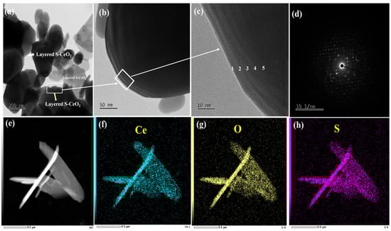 Additionally, HR-TEM was used to study the surface morphology of sulfated CeO2, as shown in Figure 4. Figure 4a–c display the HR-TEM images of S-CeO2 at various magnifications. As shown in Figure 4a, the S-CeO2 crystals with diameters of 100–200 nm were highly dispersed. In addition, the S-CeO2 crystals have a thin and transparent semi-hexagonal plate-like structure, and stacked layers can be seen at the edges. The marked region indicates the thin, layered structure of S-CeO2, which may be helpful for the surface modification of CeO2 crystal with sulfonic acid groups, thereby enhancing the electron density and X-ray-shielding activity. Figure 4b,c show the layered structure of the S-CeO2 crystals more clearly. Notably, there is a five-layer structure at the edge of the S-CeO2 crystals (Figure 4c). The SAED pattern of the S-CeO2 crystal structure is shown in Figure 4d, illustrating the highly crystalline nature of S-CeO2. The reflections are consistent with the cubic fluorite structure. Field-emission electron probe microanalysis (EPMA) was also performed on S-CeO2, and element maps were recorded (Figure S2). Figure 4e–h illustrate the S-CeO2 EPMA maps and the associated EDX data. As shown, cerium, oxygen, and sulfur atoms were uniformly distributed throughout the components. In particular, the sulfur distribution in Figure 4h clearly shows that the sulfation was successful, which is consistent with the FT-IR and XPS results. The EDX spectrum presented in Figure S2 also confirms the elemental composition of the prepared S-CeO2.
