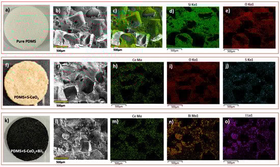 The following supporting information can be downloaded at: https://www.mdpi.com/article/10.3390/molecules28166045/s1, Figure S1: Additional data for sample preparation; Figure S2: EDX of S-CeO2; Figure S3: SEM images of PDMS; Figure S4: Elemental mapping of PDMS; Figure S5: SEM images of PDMS/S-CeO2; Figure S6: Elemental mapping of PDMS/S-CeO2; Figure S7: SEM images of PDMS/S-CeO2/BiI3; Figure S8: Elemental mapping of PDMS/S-CeO2/BiI3; Table S1: Quantitative data on the chemical composition; Table S2: Comparison of X-ray-shielding performances. References [37,38,39,40,41,42,43,44] are cited in the Supplementary Materials.