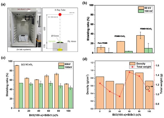 (a) Photograph of the in-lab X-ray system for the transmission measurements of coin-shaped PDMS/S-CeO2/BiI3/BiBr3 (b) X-ray-shielding ratios of pure PDMS, PDMS/CeO2, and PDMS/S-CeO2 using 60- and 100-kV X-rays, (c) X-ray-shielding ratios of S-CeO2/PDMS/BiI3/BiBr3 using 60- and 100-kV X-rays. (d) Density and total weight of the samples.