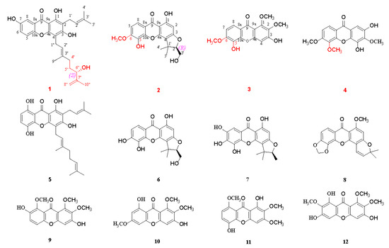 In addition to the four new xanthones 1–4, eight known xanthones 5–12 were isolated and identified as 1,3,5,8-tetrahydroxy-2-(3-methybut-2-enyl)-4-(3,7-dimethylocta-2,6-dienyl) xanthone (5) [31], cochinchinone P (6) [27], 2-deprenyl-7-hydroxy-rheediaxanthone (7) [32], musaxanthone (8) [33], 3,7-dihydroxy-1,2,8-trimethoxy-9H-xanthen-9-one (9) [34], 3,8-dihydroxy-1,2,6-trimethoxy-9H-xanthen-9-one (10) [35], 1,5-dihydroxy-2,3,8-trimethoxy-9H-xanthen-9-one (11) [12], and 1,3,6-trihydroxy-2,7,8-trimethoxy-9H-xanthen-9-one (12) [36] by comparing their experimental spectral data with the reported spectra data in the literature.