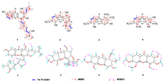 Cratocochinone D (4) holds a molecular formula of C16H14O7, which was defined by its HRESIMS spectrum exhibiting a [M + H]+ ion peak at m/z 319.0816 (calculated for C16H15O7 [M + H]+, 319.0813) indicating 10 indices of hydrogen deficiency. The 13C NMR and DEPT data of 4 revealed the presence of sixteen carbon atoms, including thirteen sp2 carbon atoms, and three methyl groups. In addition, the thirteen sp2 carbon atoms were attributable to one keto carbonyl group and two benzene ring groups. The above data revealed that the chemical structure of 4 was similar to that of 2,4-dihydroxy-3,6-dimethoxy-9H-xanthen-9-one [30]. Comparison of the NMR data of 4 (as shown in Table 2) with those of 2,4-dihydroxy-3,6-dimethoxy-9H-xanthen-9-one suggested that both compounds shared the same basic skeleton, but the molecular weight of 4 is larger than that of 2,4-dihydroxy-3,6-dimethoxy-9H-xanthen-9-one by 30 units, namely, the hydrogen atom at C-5 in 2,4-dihydroxy-3,6-dimethoxy-9H-xanthen-9-one was replaced by a methoxy group resonating at δH 3.79 (3H, s) and δC 60.9 in 4. The above elucidation was supported by the HMBC correlations of the methoxy hydrogens resonating at δH 3.79 (3H, s) to C-5 (δC 144.9), as well as the ROSEY correlations of 6-OCH3, and the methoxy group resonating at δH 3.85 (3H, s) with 5-OCH3 and H-7. Comprehensive analysis of 2D NMR (HSQC, HMBC, 1H-1H COSY, and ROSEY) spectra confirmed the chemical structure of 4 as shown in Figure 2. Thus, the chemical structure of 4 was established as shown in Figure 1.