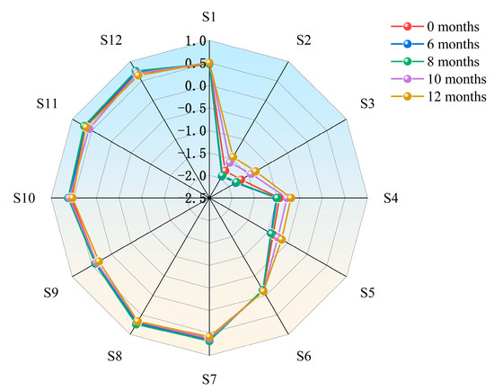The odor of nutmeg changed significantly during storage. The radar map (Figure 2) shows the changes in the response value of the E-nose during storage (0 months, 6 months, 8 months, 10 months, and 12 months). From Figure 2, it can be seen that the maximum response values of Sensors S2 and S3 were higher, followed by that of Sensor S4, and the maximum response value of Sensor S6 was lower. The most obvious changes were in Sensors S2, S3, S4, and S5, while the maximum response values of the remaining sensors almost overlapped in the radar map. The four significantly changed sensors are sensitive to ammonia/organic amines, carbon monoxide, ethanol, and hydrogen sulfide, respectively, indicating that these kinds of chemicals may be produced or changed in moldy nutmegs. Because the organic substances in nutmeg were decomposed by fungi during storage, the release of specific substances such as olefins, alcohols, aldehydes, and sulfide [35,36] could affect the flavor of food, and cause great damage to the quality of nutmeg.