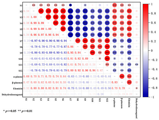 From Figure 3, it can be seen that there were significant linear negative correlations of α-pinene, β-pinene, and elemicin with S7 (organic solvents), S8 (hydrocarbons), S9 (methane), S10 (fluorine), S11 (aromatic compounds), and S12 (ethanol, ammonia, and organic amine). This indicates that the response values of the odor substances represented by these sensors increased with a decrease in α-pinene, β-pinene, and elemicin during the storage period of nutmeg. There is a highly linear positive correlation between α-pinene, β-pinene, and elemicin. However, dehydro-di-isoeugenol was almost unaffected by the odor substances and had no linear relationship with the other indicators, except for S11 (p < 0.01) and elemicin (p < 0.05).