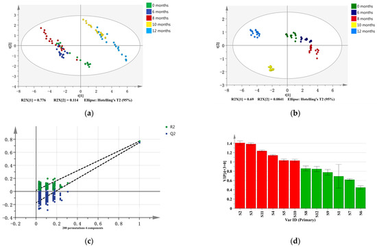 The results of the PCA plot: (a) the OPLS-DA plot; (b) the permutation test of OPLS-DA; (c) and the VIP value of the E-nose sensors in the analysis of nutmeg from different storage periods, i.e., 0 months, 6 months, 8 months, 10 months, and 12 months. Note: The red-highlighted part in (d) indicates sensors with VIP > 1.