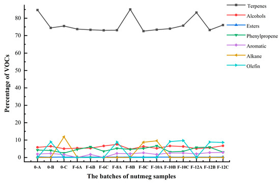 Trend chart of the proportion of various components of the volatile organic components (VOCs) of nutmeg. Note: A, B, and C represent three different batches of nutmeg.