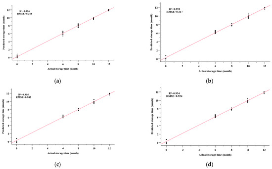 The storage times of the nutmeg samples were analyzed using BPNN, and the regression results are shown in Figure 6a–d. The BPNN model performed very effectively for predicting the storage time of nutmeg on the basis of the E-nose responses. The RMSE and R2 of the training set were 0.268 and 0.996, respectively; the results for the testing set were RMSE = 0.317 and R2 = 0.993. BPNN regression models were also set up to predict the storage time on the basis of the physicochemical indexes. As shown in Figure 6c,d, the RMSE and R2 of the training set were 0.842 and 0.956, respectively, and for the testing set, the results were RMSE = 0.924 and R2 = 0.954. The predicted results were inferior to when the E-nose responses were used.