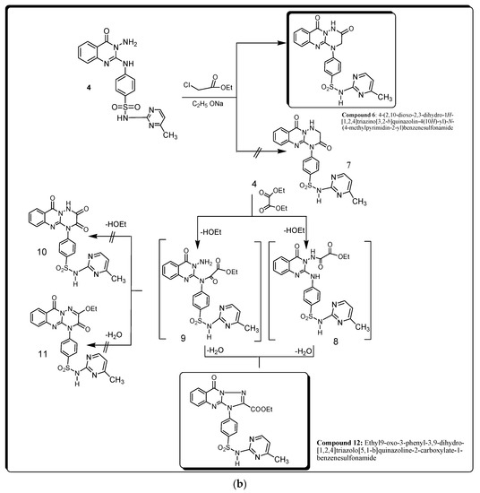 This study investigated the potential utility of methyl-2-isothiocyanato benzoic acid (compound 2) to react with sulfamerazine in DMF to give derivative 3 in high yield (Figure 1a,b). The chemical structure of compound 3 was determined using elemental and spectral data. The mass spectrum of compound 3 showed a molecular ion peak m/z at 457 (M+, 1.70%), with a base peak m/z at 131 (100%). Through its reaction with hydrazine hydrate, compound 3 enabled the successful one-step synthesis of many heterocyclic rings. These compounds were created by removing H2S (one molecule), which was identified using lead acetate test paper, and then cyclizing it intramolecularly to produce the appropriate N-amino derivative, compound 4. The mass spectrum of compound 4 revealed a molecular ion peak m/z at 423 (M+, 3.45%), with a base peak m/z at 240 (100%). Also, NH2 in position 3 of the pyrimidine ring was confirmed by reacting derivative 4 with 4-hydroxy-3-methoxybenzaldehyde in acetic acid containing fused sodium acetate. The structures of 5 and 6 derivatives were discovered using elemental analysis and spectral data. The mass spectrum of compound 5 exhibited a molecular ion peak m/z at 557 (M+, 3.5%), with a base peak m/z at 139 (100%). The IR spectra of these compounds revealed the lack of NH2 bonds and the existence of bonds for NH, CH aromatic, and SO2 groups. Refluxing compound 4 and ethyl chloroacetate in the presence of sodium methoxide solution gave compound 6, not the isomeric structure of compound 7 (Figure 2). According to our results, based on the formation of sodium salt on the less basic NH and the elimination of sodium chloride followed by cyclization, the chemical structure of compound 6 was suggested rather than the structure of compound 7 [11,12]. Its mass spectrum showed a molecular ion peak m/z at 463 (M+, 2.1%), with a base peak at 199.9 (100%). Additionally, the C=O band appeared at low frequency (1686 cm−1) in the IR chart expected for the structure of compound 6. Also, the methylene protons that appeared at 4.3 ppm in the 1H-NMR chart were more evidence supporting our hypothesis. When compound 4 was combined with diethyl oxalate, triazoloquinazoline derivative 12 was formed. These results agreed with the previously reported method [12]. Also, the mass spectrum of compound 12 revealed a molecular ion peak m/z at 509.67 (M+, 2.3%), with a base peak at 60.18 (100%).