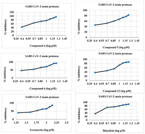 The synthesized compounds 4–6 and 12 were effective inhibitors of 3CLpro (Table 1 and Figure 2), and their activity was comparable to that of ivermectin. The IC50 values of the target compounds 4–6 and 12 were 2.012, 3.68, 1.18, and 5.47 µM, respectively, whereas those of baicalein and ivermectin were 1.72 and 42.39 µM, respectively. The IC50 values of the synthesized compounds were less than those of the reference compounds.