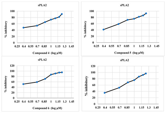 2.2.2. sPLA2 Inhibitory Activity of Synthesized Compounds 4–6, and 12