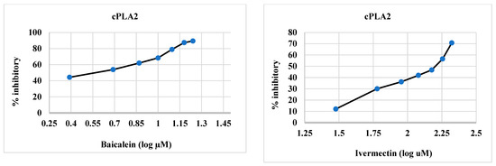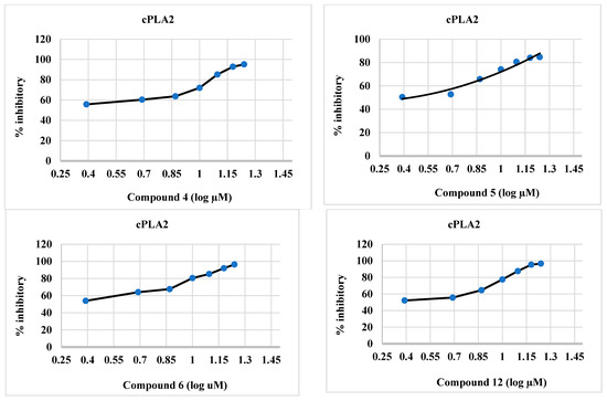 The synthesized compounds 4–6 and 12 were effective inhibitors of cPLA2 (Table 2 and Figure 4), and this activity was comparable to that of ivermectin. The IC50 values of the target compounds 4–6, and 12 were 1.44, 2.08, 0.5, and 2.39 µM, respectively, whereas those of baicalein and ivermectin were 3.88 and 138.0 µM, respectively. The IC50 values of the synthesized compounds were lower than those of the reference compounds.