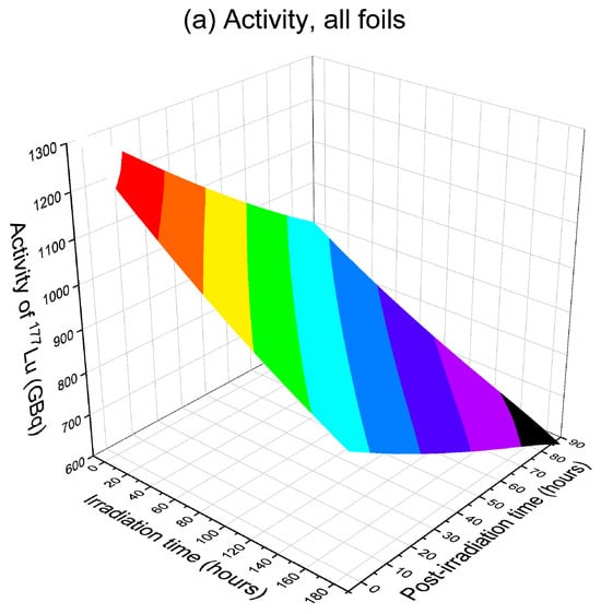 Figure 12 provides a summary of the product quality of the last foil. All figures correspond to one day of operation (two batches per day). In Figure 12a, the total activity of 177Lu reaches the maximum of approximately 337 GBq/day for an irradiation time of 12 h and a post-irradiation processing time of 4 h. Increasing either the irradiation time or the post-irradiation processing time leads to a decrease in activity. Figure 12b plots the specific activity and exhibits the existence of a peak region. At a given irradiation time, the specific activity initially increases and then decreases with increasing post-irradiation processing time. The peak value is approximately 3071 GBq/mg. For maximizing specific activity, the optimal post-irradiation processing time is around 20 h for short irradiation. The optimal post-irradiation processing time slightly reduces to about 12 h for long irradiation. Prolonged irradiation and post-irradiation processing times result in a drop in specific activity, with the lowest value reaching approximately 2590 GBq/mg, representing the worst scenario in the mapping. However, an overall high specific activity can still be ensured.