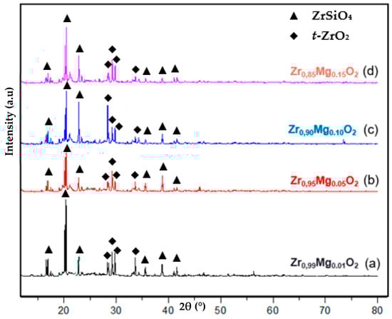 Diffractogram of Mg-PSZ drying 120 °C Zr0.99Mg0.01O2 (a), Zr0.95Mg0.05O2 (b), Zr0.90Mg0.10O2 (c), and Zr0.85MgO0.15O2 (d).