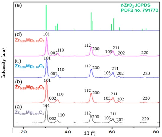 Diffractogram of Zr0.99Mg0.01O2 (a), Zr0.95Mg0.05O2 (b), Zr0.90Mg0.10O2 (c), Zr0.85Mg0.15O2 (d), and t-ZrO2 JCPDS PDF2 no. 791770 (e).