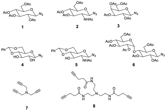 Using click chemistry, we synthesized a series of trimeric branched glycoconjugates. Figure 1 shows the structures of sugar azides 1–6 and alkyne building blocks 7–8. The sugar azides were prepared by procedures in the literature, these included the per-acetylated glucose, glucosamine, and galactose anomeric azides 1–3 [41], 4, 6-O-protected glucose and glucosamine anomeric azides 4, 5 [42], as well as the per-acetylated maltose azide 6 [43]. Using these azides and their reactions with two trimeric branched alkynes 7–8 through click reaction, we synthesized eight glycoclusters 9–16, as shown in Figure 2. After these compounds were obtained, their gelation properties were screened in several solvents and the results are shown in Table 1.