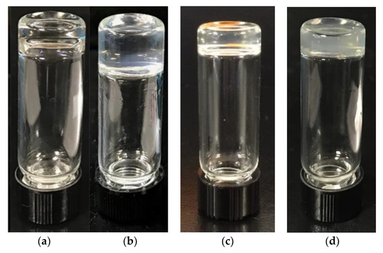 (a) A clear gel formed in toluene by compound 9 at 4.0 mg/mL; (b) a clear/translucent gel formed by compound 10 in n-PrOH at 3.3 mg/mL, (c) compound 15 in n-butanol at 5.0 mg/mL, (d) compound 15 in i-PrOH at 4.0 mg/mL.
