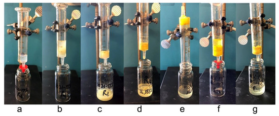 (a) A gel formed by compound 9 in EtOH/H2O (v/v 1:2) and CuSO4 pentahydrate in a syringe/column (gel column A) with a plug. (b) A solution of phenylacetylene, compound 18, and NaAsc dissolved in 1 mL of EtOH/H2O (v 1:2) was added on top of the gel column. (c) After the gel column was flushed, the gel inside the column was ready for another round of reaction mixture addition. This process was repeated five times. (d) The gel column and eluted product after round 5, (e) the gel column after 3 mL ethanol wash, the column was ready for the next reaction. (f) In the second cycle of the synthesis of compound 20 using the gel column, reactants 1, 1-octyne and NaAsc were loaded to the gel column, (g) the gel column after two cycles of the experiment.