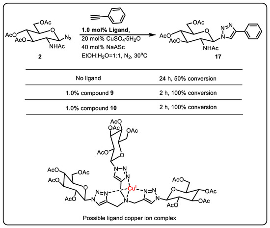 The acceleratory effects of the trimeric ligand in the click reaction and the possible ligand copper ion interaction as the active catalyst.