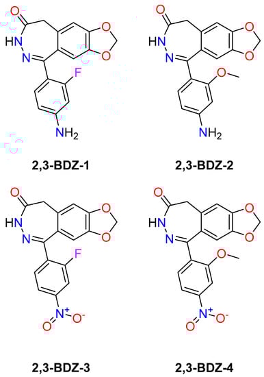 Currently, evidence indicates that several chemical groups can engage with the AMPA receptor at allosteric modulatory sites, resulting in alterations in the gating mechanism of the receptor, including processes such as activation, deactivation, and desensitization. Multiple allosteric modulators, such as 2,3-BDZ, have been extensively researched for their effects on the processes of desensitization and deactivation [9,23,24,25]. The area of 2,3-BDZ compounds has seen notable advancements, resulting in new compounds with distinct and exceptional characteristics. In addition, these substances have undergone assessment for their anxiolytic-like and antidepressant-like properties and their potential for causing memory impairment and toxicity in Swiss mice [26,27]. BDZs are a category of psychoactive substances that have been widely acknowledged for their impact on the central nervous system (CNS), namely in the regulation of GABA (γ-aminobutyric acid) and glutamate, two essential neurotransmitters responsible for maintaining brain activity equilibrium. However, GABA is the principal inhibitory neurotransmitter, and glutamate is the major excitatory complement [28]. BDZs have a facilitatory influence on the action of GABA, resulting in a net inhibitory impact on neuronal activity. Modifying physiological processes, such as drowsiness, muscular relaxation, anti-anxiety, and anticonvulsant actions, is paramount. The field of neuropharmacology emphasizes the study of 2,3-BDZs, which represent a distinct subclass within the broader category of benzodiazepines. These chemicals interact with GABA and glutamate receptors, including N-methyl-D-aspartate (NMDA) and AMPA receptors. The capacity to regulate both excitatory and inhibitory neurotransmission endows them with the capability to impact diverse neurological processes, therefore offering prospective therapeutic prospects for the treatment of numerous neurological illnesses. The distinctive capacity of 2,3-BDZs to modulate AMPA receptors sets them apart from other benzodiazepines. The selective engagement of these interactions can potentially mitigate excitotoxicity and seizure activity, presenting a potentially revolutionary treatment approach for a range of neurological illnesses that require the delicate equilibrium of excitatory and inhibitory neurotransmission.
