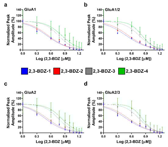 Concentration-dependent effect of 2,3-BDZ Compounds on AMPA receptor inhibition. The peak amplitudes are normalized and represented as a percentage of the control value to force the curve to run from 100% to 0%. Whole-cell responses to inhibitors are normalized to currents The normalized current amplitude derived from GluA1 subunit (a), GluA1/2 subunit (b), GluA2 (c), and GluA2/3 subunit (d) after exposure to the same set of 2,3-BDZ compounds were measured at −60 mV, pH 7.4, and 22 °C. Individual cells are exposed to different concentrations of 2,3-BDZ compounds. Each concentration is applied to the cell for 500 ms before being rinsed out for 20 ms. Following many washout periods, glutamate (10 mM) is supplied alone. Symbols/error bars represent the mean ± SEM for 8 cells.