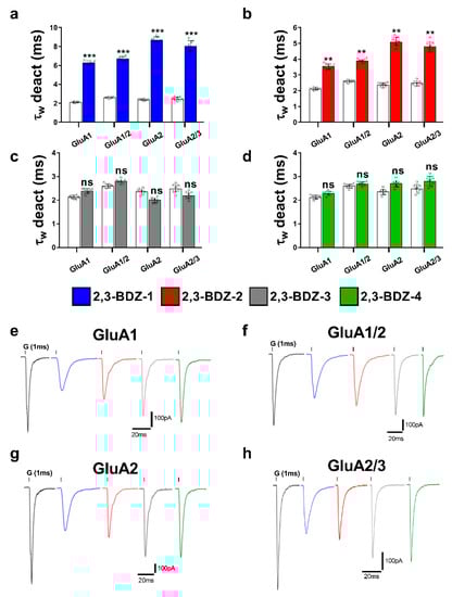 Deactivation rate (τw deact) of AMPAR subunits after applying the 2,3-BDZ derivatives. The normalized whole-cell current traces of AMPAR were recorded upon 1 ms application of 10 mM glutamate (G, indicated above the current trace) to whole-cell recording from HEK293T cells expressing homomeric GluA1 (e), GluA2 (g), heteromeric GluA1/2 (f) and heteromeric GluA2/3 (h), with glutamate alone (black) or in combination with 2,3-BDZ-1 (16 µM) (Blue), 2,3-BDZ-2 (16 µM) (Red), 2,3-BDZ-3 (16 µM) (Gray), or 2,3-BDZ-4 (16 µM) (Green)—the Mean Weighted Tau Desensitization presented in Figures (a–d). The whole-cell current is recorded under controlled conditions of pH 7.4, temperature of 22 °C, and a voltage of −60 mV. The data are presented in the format of mean ± SEM, with a sample size of n = 8 patch cells in the whole-cell configuration. The dots plotted above each column depict the current generated by each cell of the eight cells that were examined following the application of the compound. These dots have been graphed to visually represent the corresponding column. The statistical significance of the one-way ANOVA was determined using the following criteria: (**) p < 0.01, (***) p < 0.001, and ns indicating not significant.