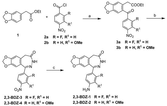 The synthesis of target compounds is carried out according to the sequence of reactions detailed in Scheme 1. SnCl4-catalyzed Friedel-Craft acylation of ethyl 3,4-methylenedioxy phenylacetate 1 with either 2-fluoro-4-nitrobezoylchloride 2a or 3-methoxy-4-nitrobenzoyl chloride 2b in dry CH2Cl2 yields the required ketoester intermediates 3a and 3b in 40% and 48% yields, respectively. Ethyl 4,5-(methylenedioxy)-2-(2-fluoro-4-nitrobenzoyl) phenyl acetate 3a was treated with hydrazine in refluxing ethanol to yield diazepin 2,3-BZD-3 in 44% yield, after which the nitro-group was reduced by Pd-catalyzed hydrogenation to yield the desired amine 2,3-BZD-1, which is found to be highly insoluble. Acetic acid promoted a cascade reaction (imine formation followed by cyclization) of ethyl 4,5-(methylenedioxy)-2-(3-methoxy-4-nitrobenzoyl) phenyl acetate 3a with hydrazine hydrate in ethanol afforded 2,3-BZD-4 in a 33% yield. High yield and purity of 2,3-BZD-1 were achieved via Pd-catalyzed hydrogenation of the nitro group in 2,3-BZD-4 in methanol. The generated compounds have physical and spectral (1H-NMR) data consistent with their proposed structures.