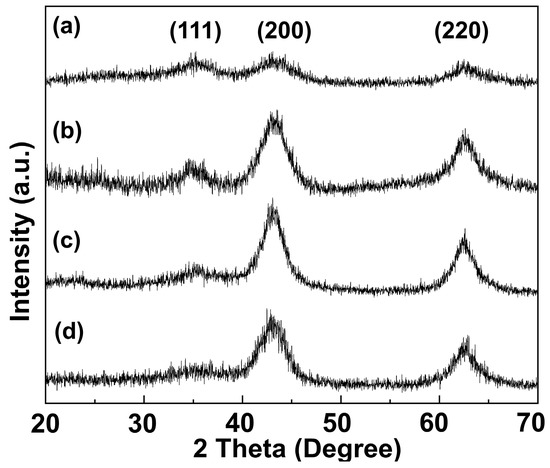 It was confirmed from the XRD patterns (Figure 2) that the four MO had the same crystal phase of periclase (MgO, JCPDS No. 71-1176), with a slight difference in crystallinity depending on the Mg/Al ratios. The diffractograms showed distinctive peaks at 2θ values of 35.04°, 43.07°, and 62.44° corresponding to (111), (200), and (220) planes of periclase, respectively. As previously reported [25], MgAl-CO3-LDH underwent dehydration, dehydroxylation, and decarbonization upon heat treatment resulting in the evolution of mixed metal oxide. During the course, most of the Mg2+ cations maintained their coordination site in the octahedral center; on the other hand, the Al3+ cations underwent partial preservation of octahedral coordination and partial migration to the tetrahedral site [15]. In this way, the major building block of MO would be MgO rather than Al2O3. As expected, we could not observe any peak corresponding to Al2O3 even for the MO-1 having the highest Al content. The lattice parameter of all four MO showed the same value of a = 4.19 Å. The results revealed that the Mg/Al ratio in the starting LDH did not affect the phase transformation from LDH to the metal oxide through calcination.