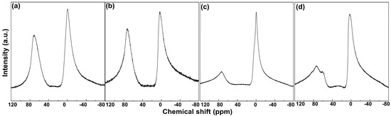 Solid state 27Al MAS-NMR spectra of (a) MO-1, (b) MO-2, (c) MO-3, and (d) MO-4.