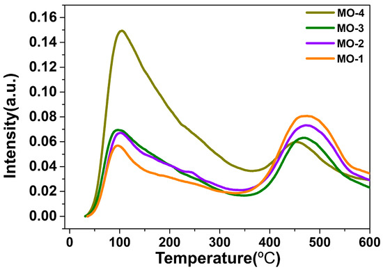 The acidity of the four MO samples was estimated via NH3-TPD as shown in Figure 6. The desorption peaks formed at a low-temperature (60–150 °C) range were attributed to the physically adsorbed ammonia at the weak acidic sites of the MO samples, whereas the peaks observed at a higher temperature (400–600 °C) range resulted from the desorption of NH3 molecules at the strong acidic sites [46,47].