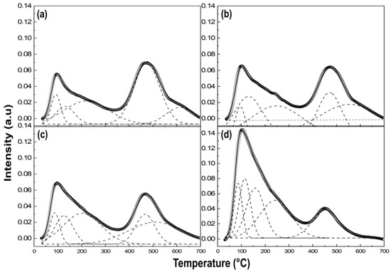 Deconvoluted NH3-TPD spectrum: (a) MO-1, (b) MO-2, (c) MO-3, and (d) MO-4 (solid line: observed data; open circles: summation of separated peaks; dotted lines: each peak components).