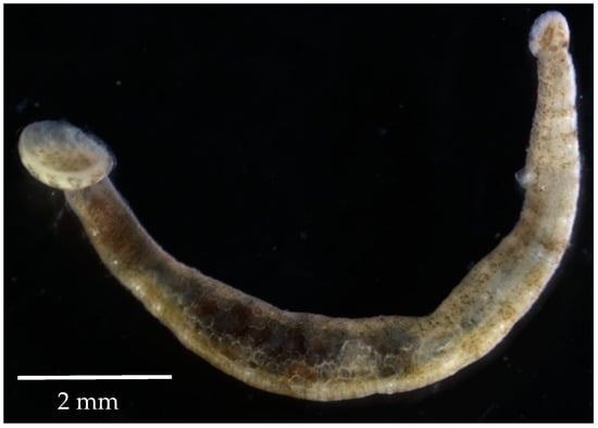 - Nagasawa, K.; Uyeno, D. Zeylanicobdella arugamensis (Hirudinida, Piscicolidae), a leech infesting brackish-water fishes, new to Japan. Biogeography 2009, 11, 125–130. [Google Scholar]
