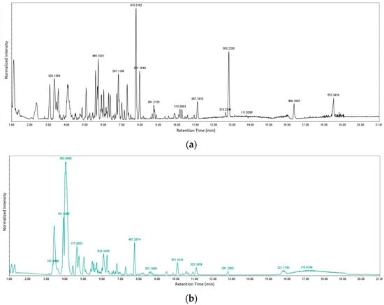 Chromatograms for (a) positive and (b) negative modes of data acquisition.