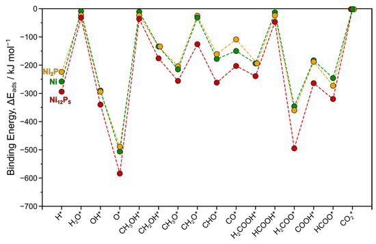 Trends in binding energies ΔEads (kJ mol−1) for all surface intermediates examined in this study over Ni (green) and Ni12P5 (red) surfaces compared to Ni2P (yellow) examined in our previous study [32]. Dashed lines are provided as visual guides. Asterisk (*) denotes a surface site.