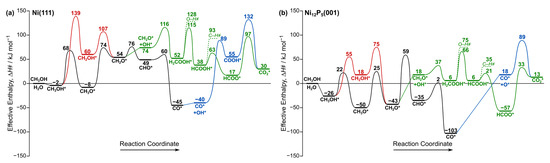 Methanol (CH3OH) can either undergo C–H or O–H bond activation (reactions 1 and 2; Table 2) on the Ni(111) surface. However, the activation barrier of the C–H bond to form CH2OH* (141 kJ mol−1) is twice that of O–H bond activation required to form CH3O* (70 kJ mol−1), suggesting that the methoxy formation route is more favorable. Similarly, on the Ni12P5(001) surface, O–H activation in methanol is more favorable by 33 kJ mol−1. In order to assess the relative preference of the various reaction routes shown in Scheme 1, we next analyze the effective enthalpy barriers (ΔH҂; Equation (5)) as shown in Figure 2. These ΔH҂ values are referenced to the energies of gas-phase methanol and water, which is particularly relevant when the reaction involves water.
