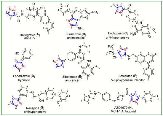 Oxadiazoles are five-membered heterocyclic compounds that contain two nitrogen atoms and one oxygen atom. On the basis of the arrangement of nitrogen and oxygen atoms, there are four different isomers of oxadiazoles [1]. The isomeric 1,3,4-oxadiazole ring is generally advantageous in terms of thermal and metabolic stabilities, water solubility, as well as lipophilicity profiles [2,3]. 1,3,4-Oxadiazoles act as a flat aromatic linker in some cases, giving the molecule a better orientation to bind to biological targets [3]. Many drugs such as raltegravir (anti-HIV) (A), furamizole (antibacterial) (B), tidazosin (α1-adrenergic receptor antagonist) (C), fenadiazole (hypnotic) (D), zibotentan (anticancer) (E), setileuton (MK-0633; LOX inhibitor) (F), nesapidil (vasodialator) (G), and AZD1979 (melanin concentration receptor 1 antagonist) (H) contain a 1,3,4-oxodiazole ring in their structure (Figure 1) [4,5,6,7,8,9,10,11]. The anticancer [12,13,14], antitubercular [15,16], anti-HIV [17], antimicrobial [18], anti-inflammatory [19], anticonvulsant [20], and antimalarial [14] activities, as well as many other biological activities [1,21,22,23,24] reported in the literature, have drawn a lot of attention to 1,3,4-oxadiazole analogues.